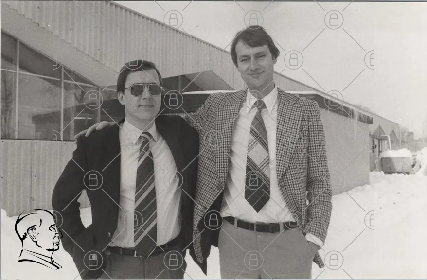 svartvitt, män, kostymer, slipsar, solglasögon, snö, byggnad, 1980-tal, vänner, affärsmän, leende, utomhus, stil, mode, fotografi, professionell, arm runt axeln, formell klädsel, retro, klassisk