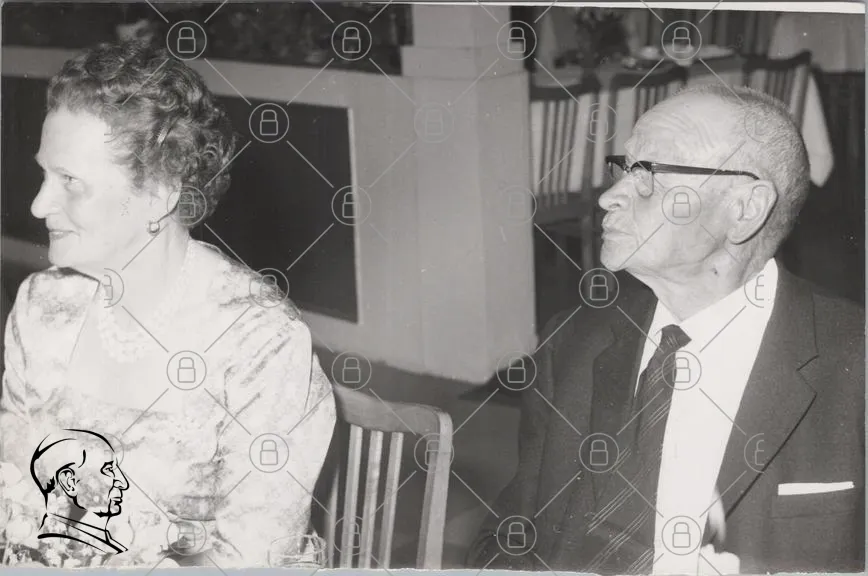 svartvit, äldre par, fest, sittande, kläder, leende, bord, stolar, inomhus, dekoration, minnen, samvaro, tradition, sällskap, ansikten, uttryck, glasögon, hår, kvinna, man, klänning, kostym, evenemang, bakgrund, belysning, tidsepok, nostalgi, gemenskap, festligheter, familj