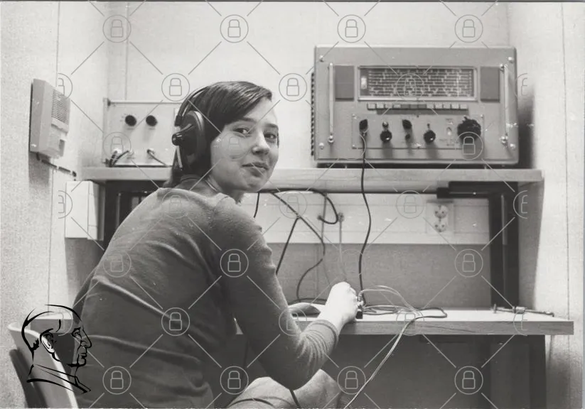 kvinna, hörlurar, radio, teknik, svartvitt, retro, kontor, utrustning, kommunikation, 1970-tal, vintage, ljud, arbete, maskin, skärm, mikrofon, kablar, station, signal, elektronisk