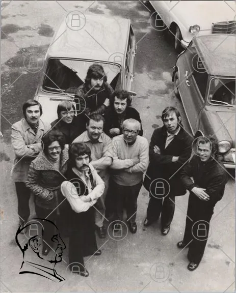 svartvitt, grupp, män, kvinnor, bilar, 1970-tal, kläder, leenden, fotografering, gator, retro, stil, ansikten, samling, vänner, minnen, nostalgi, porträtt, gemenskap, skratt, stadsbild, parkering, historisk, kultur, samhälle, interaktion, uttryck, samarbete, tradition