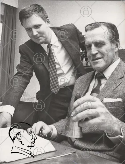 svartvit, foto, män, kostymer, kontor, dokument, skrivbord, affärsmöte, 1970-tal, professionell, leende, interaktion, papper, kavaj, slips, handskakning, affärsrelation, retro, vintage, diskussion, samarbete