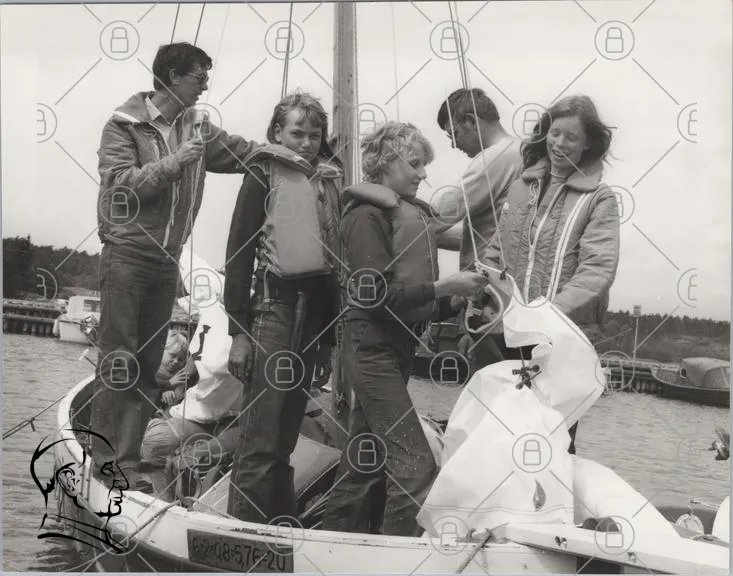 båt, segling, människor, ungdomar, sjö, kläder, livbojar, segel, hamn, 1970-tal, svartvitt, aktiviteter, utomhus, skratt, samarbete, vänner, sport, fritid, roligt, natur