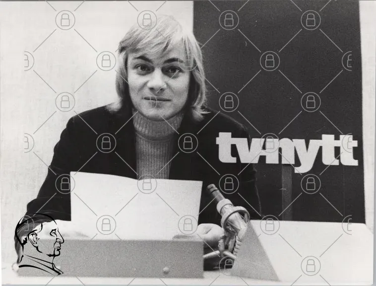 man, svartvitt, tv, nyheter, journalist, 1970-tal, studio, mikrofon, skrivbord, kläder, hår, ansikte, media, reportage, presentation, information, kommunikation, program, kamera, sändning, tidning, text, mikrofonstativ, bakgrund, belysning, professionell, uttryck, fokus, sittande, arbete, teknik
