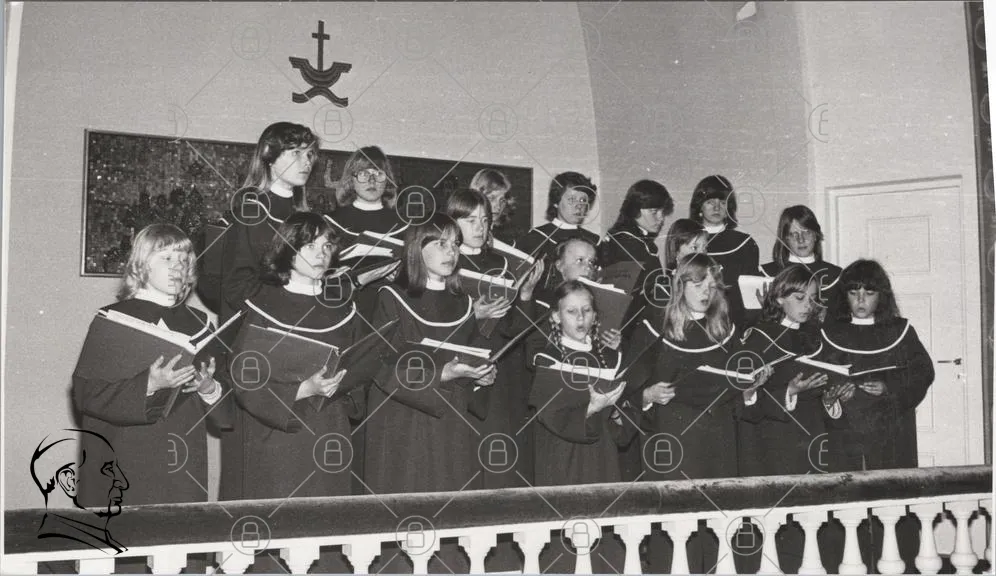 kör, sång, ungdomar, kläder, svartvitt, musik, uppträdande, skolor, gemenskap, tradition, instrument, noter, scen, kultur, 1970-tal, tjejer, pojkar, samling, prestation, glädje, konst, föreställning, bakgrund, kyrka, evenemang, grupp, artister, ungdomskör, sångare, klädkod