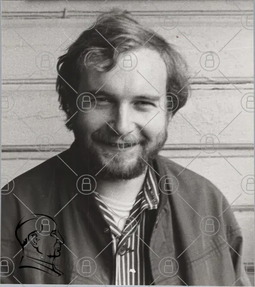 man, leende, skägg, svartvitt, porträtt, kläder, jacka, skjorta, trävägg, fotografi, 1980-tal, casual, ansikte, hår, ungdomlig, nostalgi, uttryck, person, människa, stil, retro, vänlig, naturlig, avslappnad, kultur, historia, minne, identitet, social