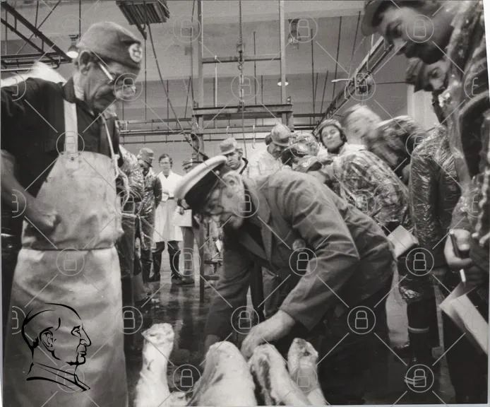 slakteri, kött, arbetare, svartvitt, industri, tradition, djur, slakt, människor, arbetsplats, kläder, verktyg, samarbete, process, historia, hantverk, mat, produktion, yrke, utbildning, miljö, teknik, säkerhet, hygien, teamwork, observation, utbildning, erfarenhet, kultur, samhälle