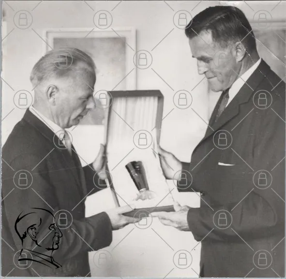 pris, utmärkelse, män, presentation, diplom, svartvitt, kläder, kostym, gest, handskakning, historisk, fotografi, hedersbevis, medalj, kontor, bakgrund, porträtt, tradition, ceremoni, vänskap, respekt, prestation, betydelse, kultur, minne, 1900-tal, samarbete, erkännande, symbol