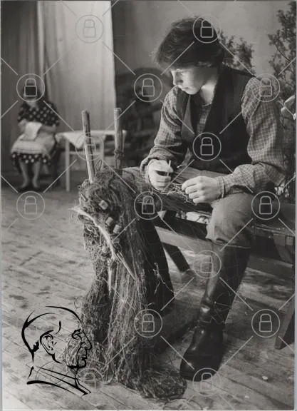 svartvitt, foto, hantverk, kvinna, man, sittande, arbete, traditionellt, inomhus, trä, kläder, handarbete, vävning, skor, stolar, miljö, 1900-tal, kultur, historia, textil, kreativitet
