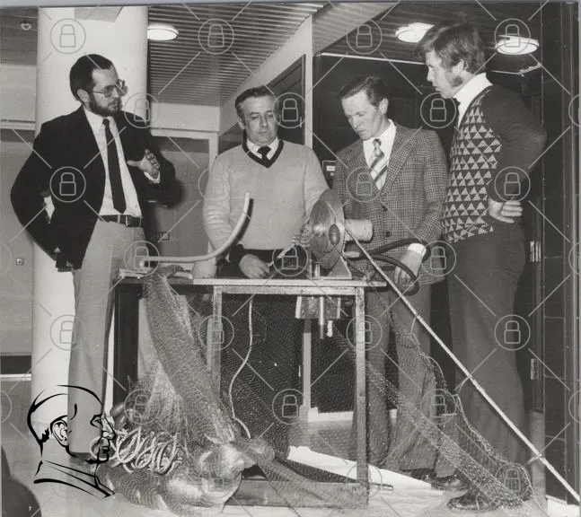 fyra män, diskussion, bord, maskin, teknik, kontor, nät, 1970-tal, presentation, forskning, vetenskap, kläder, glasögon, skägg, professionell, grupp, idéer, innovation, prototyp, arbetsmiljö, inomhus, svartvitt, historisk, samarbete, projekt, analys, experiment, design, ingenjör