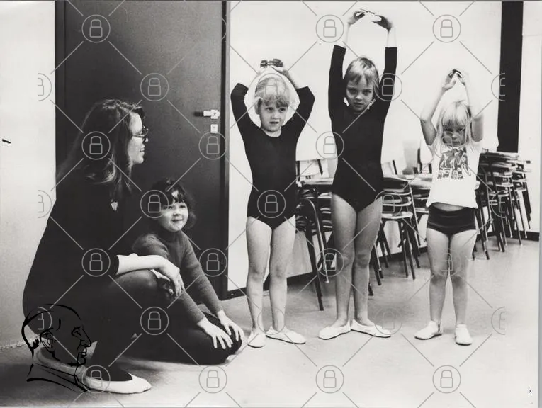 barn, gymnastik, träning, svartvitt, lektionssal, tjejer, leda, övningar, kläder, barngymnastik, 1970-tal, sport, grupp, instruktör, rörelse, koncentration, lek, klassrum, gymnastikdräkt, barnaktiviteter, samarbete