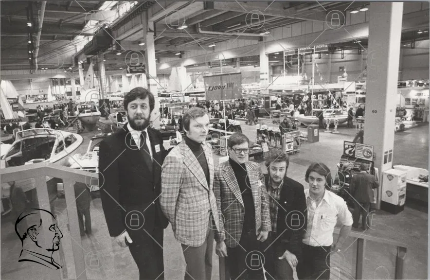 mässa, utställning, män, kläder, 1970-tal, svartvitt, bilar, stående, grupp, affärsmän, kontor, professionell, interiör, evenemang, teknik, produkter, reklam, stil, mode, företag, samarbete, presentation, publik, bakgrund, industri, nätverk, socialt, affärsrelationer, historisk