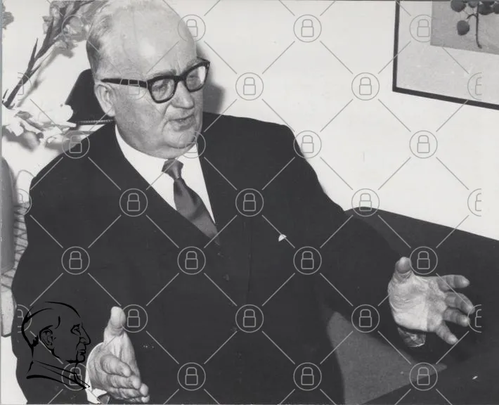 man, glasögon, kostym, skjorta, slips, sittande, gestikulera, svartvitt, porträtt, inomhus, kontor, äldre, professionell, diskussion, uttryck, händer, bakgrund, möbler, väggkonst, blommor