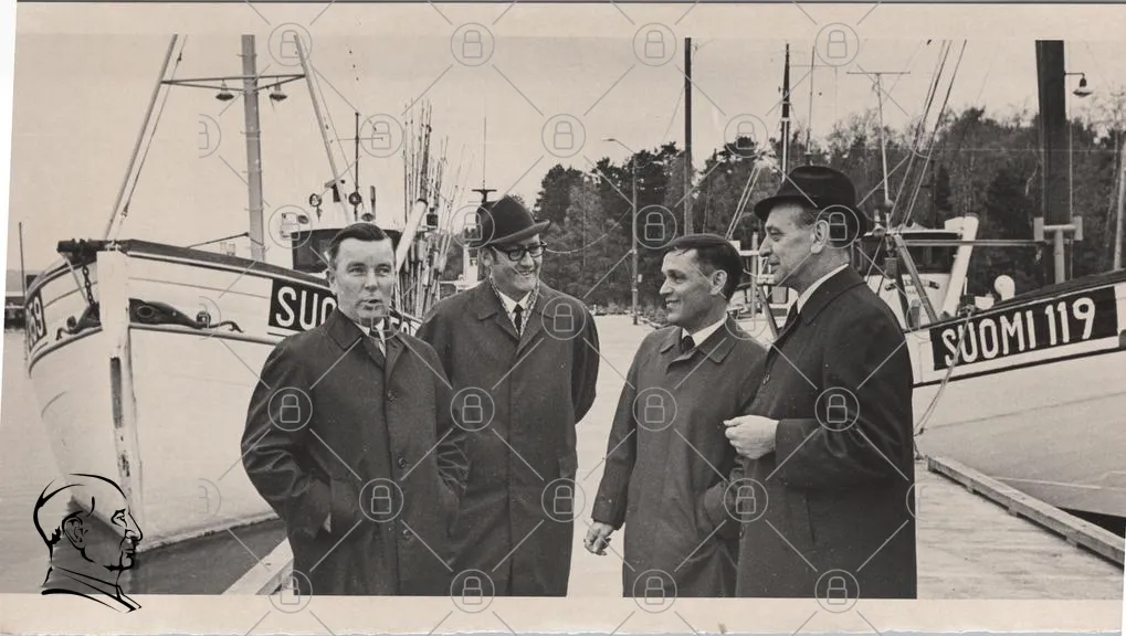 historisk, svartvit, män, kostymer, hattar, hamn, båtar, träff, 1960-tal, affärsmän, porträtt, gruppbild, utomhus, skärgård, Sverige, vänskap, samtal, stil, nostalgi, fotografi, tradition, möte, landskap, sjöfart, industri, kultur, kläder, ansikten, uttryck