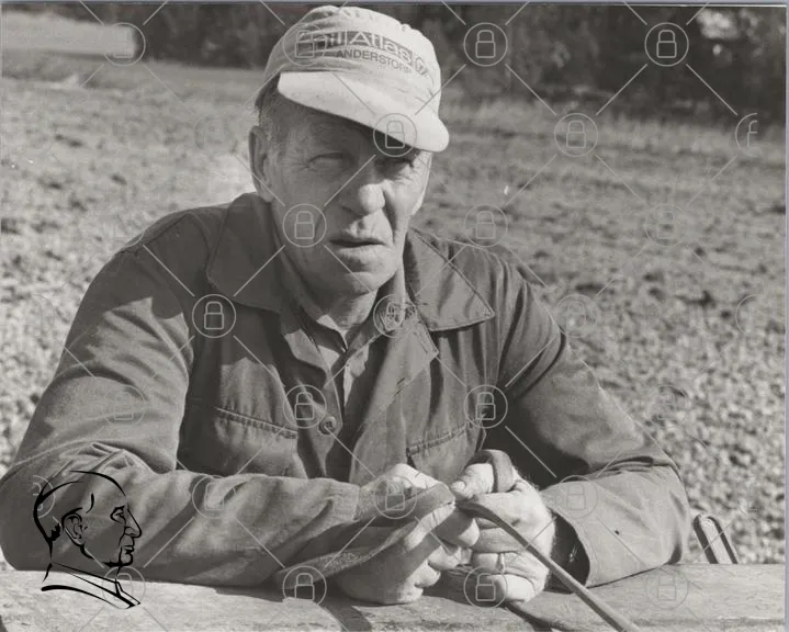 man, hatt, jordbruk, fält, svartvitt, kläder, arbete, landskap, ansiktsuttryck, händer, verktyg, gammal, traditionell, utomhus, natur, svensk, fotografi, historia, rural, landsbygd