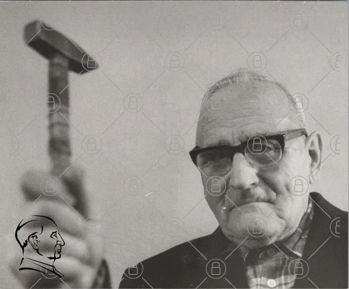 man, hammare, glasögon, svartvitt, porträtt, verktyg, gammal, ansikte, hand, kläder, skjorta, uttryck, arbete, hantverk, tradition, industri, fokus, människa, generation, historia