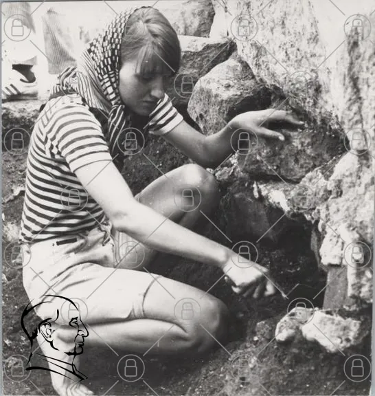 grävning, arkeologi, kvinna, svartvit, kläder, shorts, randig tröja, huvudduk, sten, utgrävning, arbete, historisk, forntida, fynd, jord, verktyg, fokus, natur, forskning, kultur, utbildning
