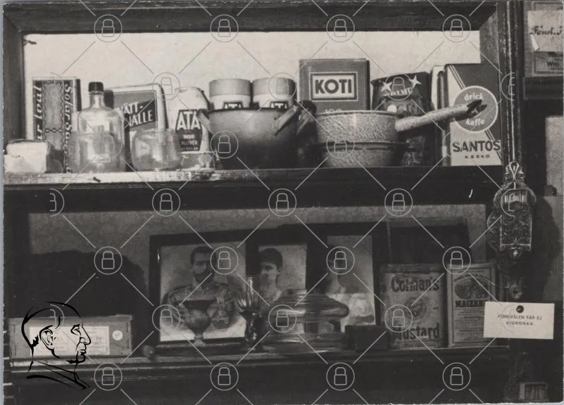 hyllor, burkar, glasflaskor, kryddor, KOTI, ATA, SANT, fotografier, glas, skålar, senap, konserver, kök, retro, inredning, gammal, matlagning, köksutrustning, vintage, föremål, samling, svartvitt, stillhet, nostalgi, tradition