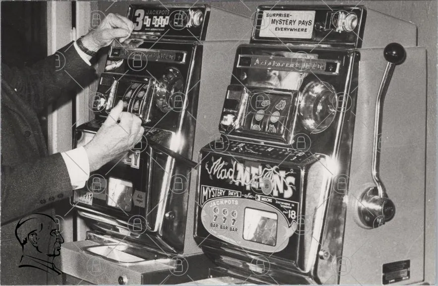 spelautomat, jackpot, mynt, hasardspel, casino, retro, svartvitt, vintage, maskin, underhållning, spel, pengar, spelande, nöje, 777, bar, mystik, överraskning, betalning, arm, hand, knappar, skärm, ljud, mekanisk, design, 1960-tal, nostalgisk, spelupplevelse, spelare, tur