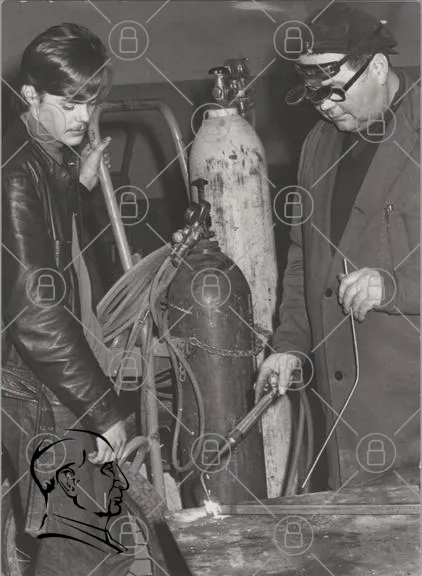 svartvitt, män, svetsning, gasflaskor, verktyg, industri, arbete, säkerhet, handskar, maskiner, metall, teknik, 1970-tal, arbetsplats, svetsutrustning