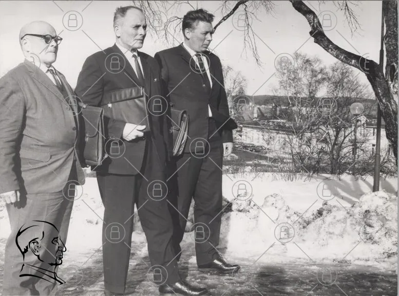 tre män, kostymer, väskor, snö, träd, vinter, svartvitt, utomhus, landskap, formella kläder, 1960-tal, stående, professionella, män i kostym, affärsmän, historisk bild, gruppfoto, stil, traditionell, allvarliga, kontorskläder, möte, bakgrund, natur, kallt väder, kläder, ansiktsuttryck, fotografi, retro
