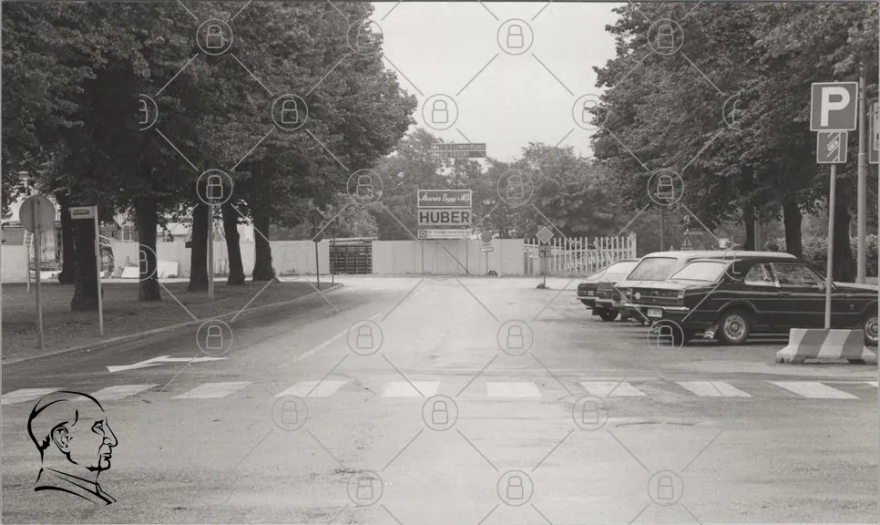 gata, träd, skylt, Huber, parkering, svartvit, väg, trafik, byggnader, grönska, övergångsställe, landskap, stadsmiljö, asfalt, tomt, gräsmatta, staket, moln, bil, vägskylt, fotgängare, område, urban, natur, stillhet, lugn, infrastruktur, miljö, panorama