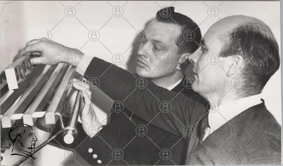 två män, svartvitt, teknik, demonstration, maskin, kontor, 1960-tal, forskning, samarbete, professionell, kläder, ansiktsuttryck, händer, interaktion, fokus, presentation, verktyg, innovation, utbildning, experiment, industri, vetenskap, historia, retro, bild, fotografi, analys, arbete, teknikprylar, detaljer