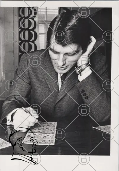 man, kostym, penna, bingo, spel, papper, koncentration, 1970-tal, svartvitt, inomhus, bord, hand, ansiktsuttryck, kläder, stil, aktivitet, underhållning, socialt, nöje, hobby, nostalgisk