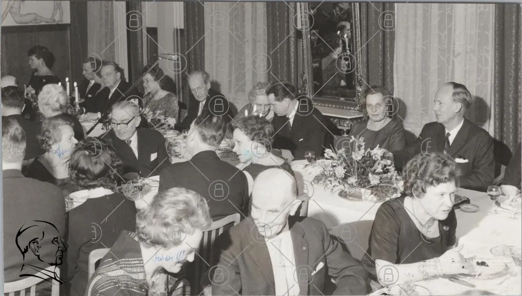 middag, fest, människor, kläder, bord, mat, dryck, blommor, 1950-tal, svartvitt, samling, samtal, eleganta, leenden, dekorationer, spegel, stolar, sällskap, evenemang, socialt, tradition, kultur, historisk, festlig, glädje, gemenskap, artighet, stil, minnen, fotografi