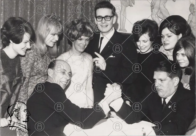 svartvitt, 1960-tal, armkamp, fest, kläder, glasögon, leende, kvinnor, män, retro, socialt, samling, fotografi, historiskt, nöje, interaktion, bord, bakgrund, hårstil, uttryck, kultur, evenemang, grupp, ungdomar, stil, ansikten, gemenskap, nostalgi, underhållning