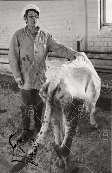 ko, man, bondgård, mjölk, djur, svartvit, arbete, jordbruk, kläder, gummistövlar, stall, lantbruk, tradition, landsbygd, husdjur