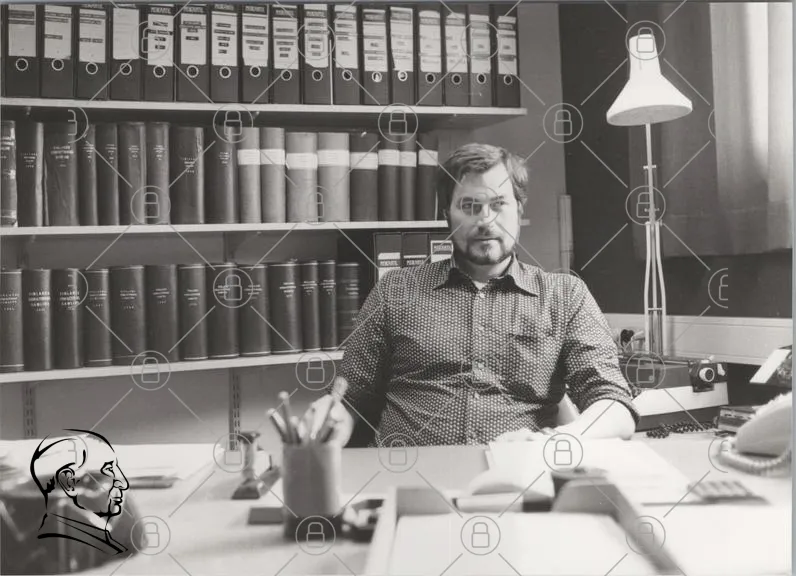 man, kontor, skrivbord, böcker, pärmar, lampor, papper, kontorsmaterial, svartvitt, kläder, skjorta, skrivmaskin, arbetsplats, dokument, organisation, inredning, fokus, professionell, retro, stil, arbetsrum, kontorsstol, skrivbordslampa, kontorsliv, kreativitet, arbete, manlig, uttryck, koncentration