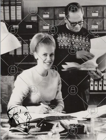 svartvit, kontor, kvinna, man, dokument, skrivbord, leende, böcker, papper, 1960-tal, retro, arbetsmiljö, kontorsarbete, glasögon, kläder, kontorsmaterial, arkiv, arbetsuppgifter, samarbete, professionell