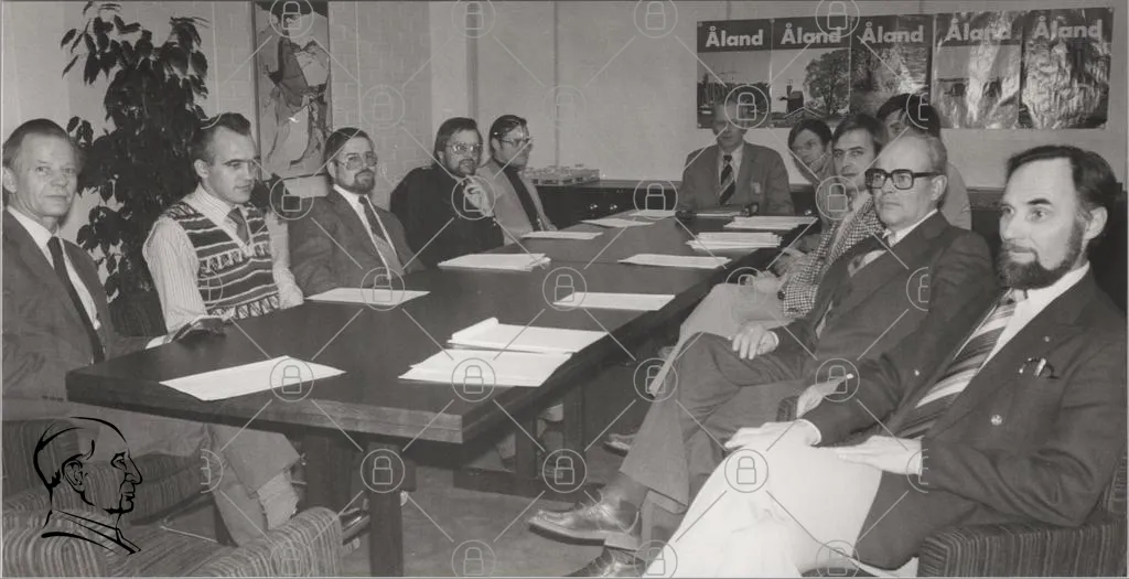 möte, konferens, affärsmän, diskussion, bord, papper, dokument, kostymer, glasögon, svartvitt, Åland, grupp, inomhus, professionellt, 1970-tal, män, ledarskap, samarbete, presentation, kontor