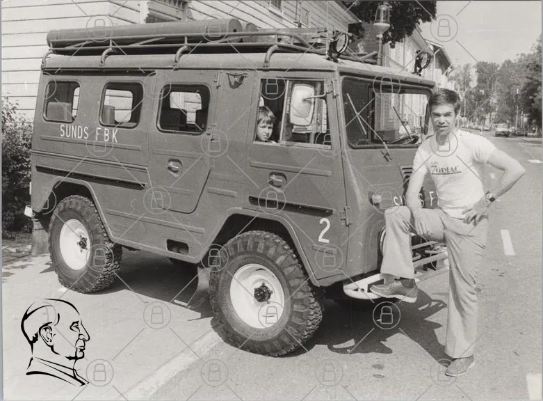 fordon, militär, jeep, barn, man, 1970-tal, svartvitt, gator, byggnader, däck, FBK, ungdom, kläder, fönster, takräcke, landskap, retro, transport, utomhus, fotografering, historisk, fordonstyp, person, lastbil, stil, nostalgi, svensk, landsbygd, motorfordon