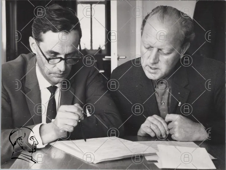 två män, skrivbord, dokument, anteckningar, glasögon, svartvitt, samarbete, diskussion, kontor, 1960-tal, professionell, affärsmöte, papper, penna, fokus, ansiktsuttryck, kläder, interiör, skrivande, arbete, koncentration, kommunikation, idéutbyte, forskning, planering, analys, strategi, beslut, kreativitet, intellektuell