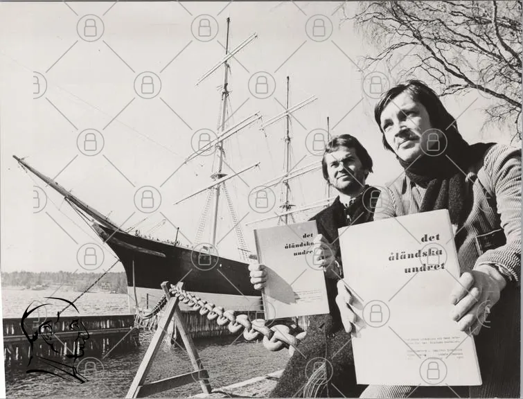 skepp, segelbåt, män, böcker, det främmande undret, det äländska undret, svartvitt, hamn, kedja, träd, vatten, historia, kultur, fotografi, 1970-tal, Sverige, maritim, dokument, presentation, konst, natur