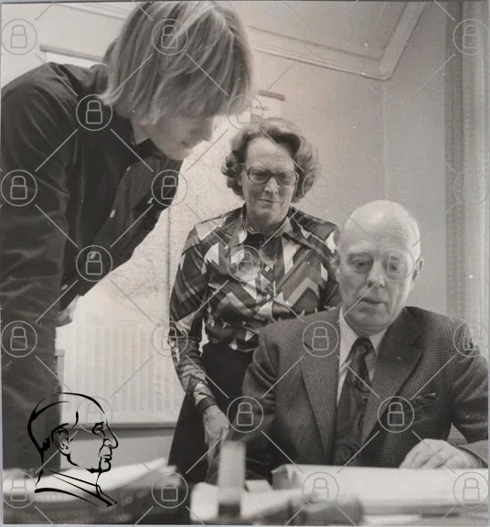 personer, möte, kontor, svartvitt, 1970-tal, kläder, dokument, skrivbord, karta, man, kvinna, diskussion, ansiktsuttryck, papper, anteckningar, professionell, samarbete, retro, stil, interiör, fokus, arbete, grupp, äldre, yngre, formell, kontorsmiljö, kommunikation, presentation, information