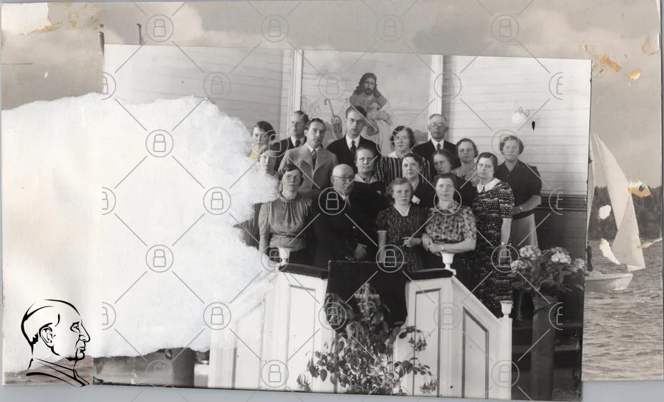 grupp, människor, svartvitt, kyrka, porträtt, gammal, samling, kläder, traditionell, leenden, familj, historia, 1900-tal, inomhus, religiös, gemenskap, fest, minnen, konstverk, bänkar, altar, fotografi, festligheter, äldre, ungdomar, kvinnor, män, barn, ansikten, samhörighet
