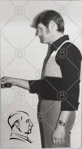 man, svartvitt, vägg, dörr, hand, nyckel, kläder, 1970-tal, stil, inomhus, interiör, ansiktsuttryck, fokus, detaljer, retro, vintage, teknik, lås, säkerhet, gest, kroppsspråk, aktivitet, tidsepok, fotografi, porträtt, manuell, mekanisk, traditionell, miljö, rum