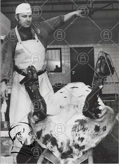 man, ko, slakt, djur, kött, industri, arbete, svartvitt, handskar, förkläde, verktyg, gård, jordbruk, tradition, mat, produktion, veterinär, slakteri, historisk, bild, människa, djurhållning, livsmedel, yrke, profession, kropp, djurdelar, säkerhet, hygien
