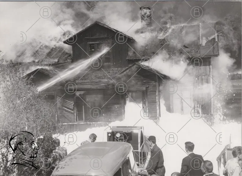 brand, hus, brandmän, släckning, rök, vatten, gammalt hus, brandbil, 1950-tal, svartvitt, räddningstjänst, brandutrustning, eldsflammor, skador, samhälle, historisk, brandplats, människor, arbete, säkerhet, katastrof, byggnad, brandrisk, brandövning, brandbekämpning, brandfarligt, brandorsak, brandinsats, brandstation