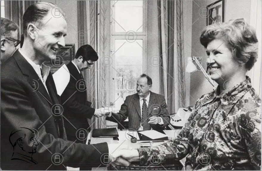 handtryck, möte, kontor, affärsmän, kvinnor, 1980-tal, svartvitt, dokument, skrivbord, kläder, professionell, samarbete, förhandling, leenden, bakgrund, fönster, interiör, relationer, diskussion, formell