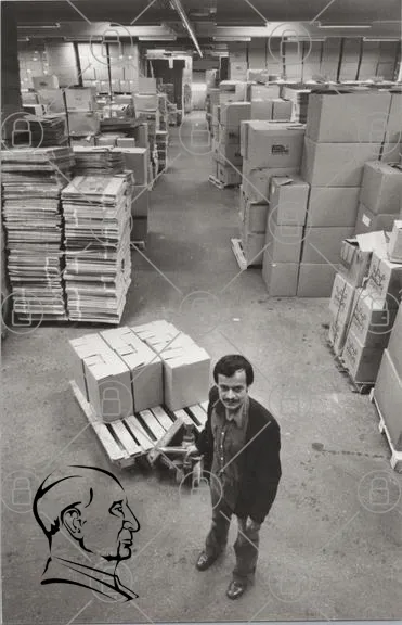 lager, kartonger, pall, man, svartvitt, industri, förvaring, arbetsplats, lådor, logistik, 1970-tal, lagerlokal, staplar, golv, kontor, arbetsmiljö, varor, transport, personal, arbetskläder