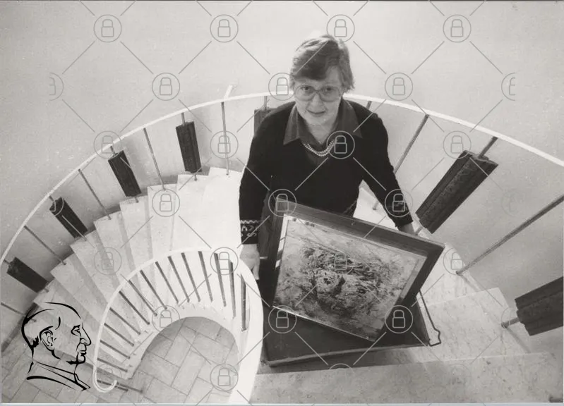 trappa, kvinna, svartvitt, konst, målning, ram, inomhus, spiraltrappa, glasögon, leende, kläder, heminredning, fotografi, konstnär, kultur, vintage, 1900-tal, interiör, konstverk, porträtt