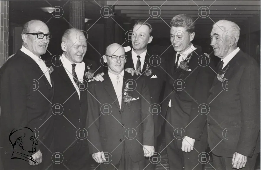 svartvit, män, kostymer, slipsar, blommor, gruppfoto, 1960-tal, formella kläder, leende, inomhus, porträtt, affärsmän, traditionell, samling, fest, eleganta, stiliga, män i kostym, socialt, evenemang, historisk, nostalgi, vänskap, professionell, samarbete, firande, gemenskap, minnen, artighet, respekt