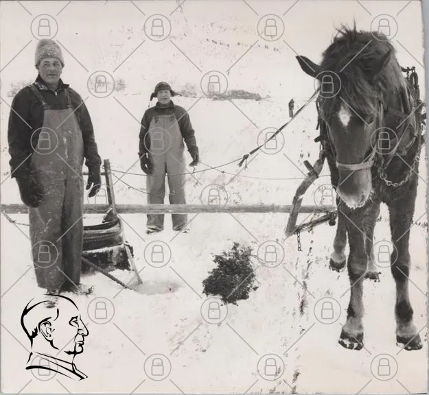 vinter, snö, häst, människor, is, arbete, utomhus, vinterkläder, mössa, rep, landskap, gammal bild, svartvitt, natur, kyla