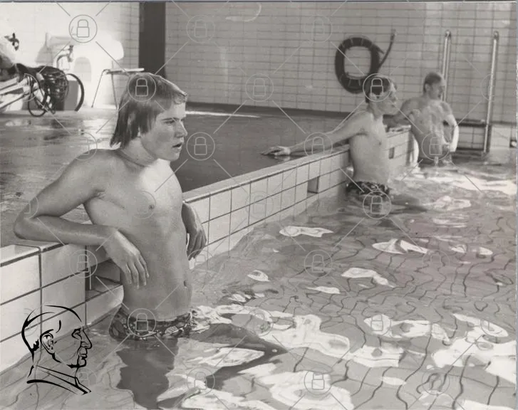simhall, pojkar, vatten, bad, svartvit, 1970-tal, simma, avslappnad, badkläder, ungdomar, inomhus, pool, lek, sport, socialt, nöje, träning, kamratskap, ungdom, simning, aktivitet, retro, nostalgi, stil, livsstil, vattensport, fritid, gemenskap, ungdomskultur, badhus