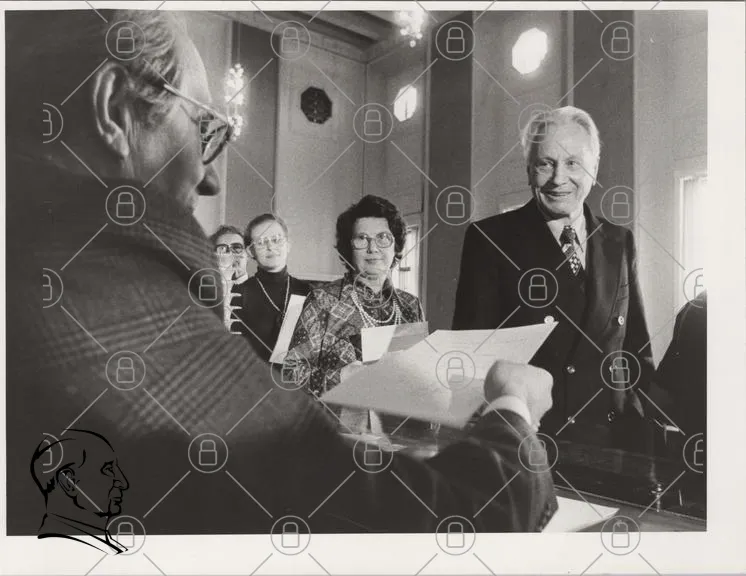 möte, personer, dokument, svartvitt, kontor, diskussion, kläder, 1970-tal, ansikten, papper, leenden, glasögon, kvinnor, män, inomhus, presentation, samarbete, historia, professionellt, formellt