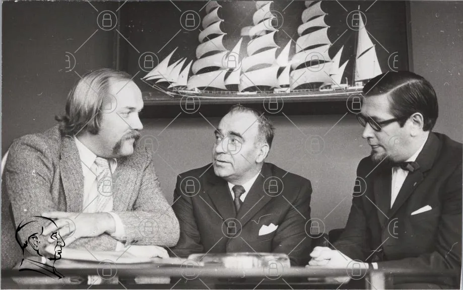möte, män, kostymer, tavla, segelbåt, diskussion, bord, slipsar, glasögon, interiör, svartvitt, konversation, formellt, grupp, porträtt