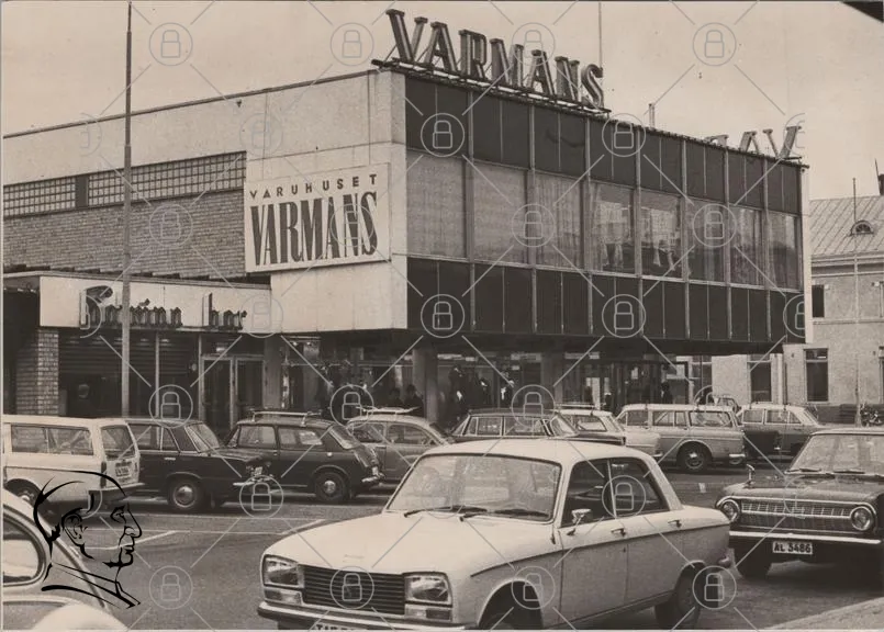 Varmans, varuhus, Yaruhuset, byggnad, 1970-tal, bilar, parkering, fasad, skyltar, människor, retro, stadsmiljö, butik, shopping, arkitektur, svartvit, gammal, trafik, entré, komposition